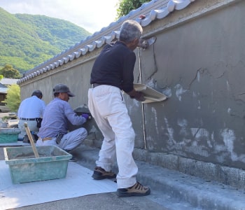 風雨にさらされた土塀のひび割れや崩れは、下地にモルタル塗りで補強し、上塗り塗装で仕上げます。